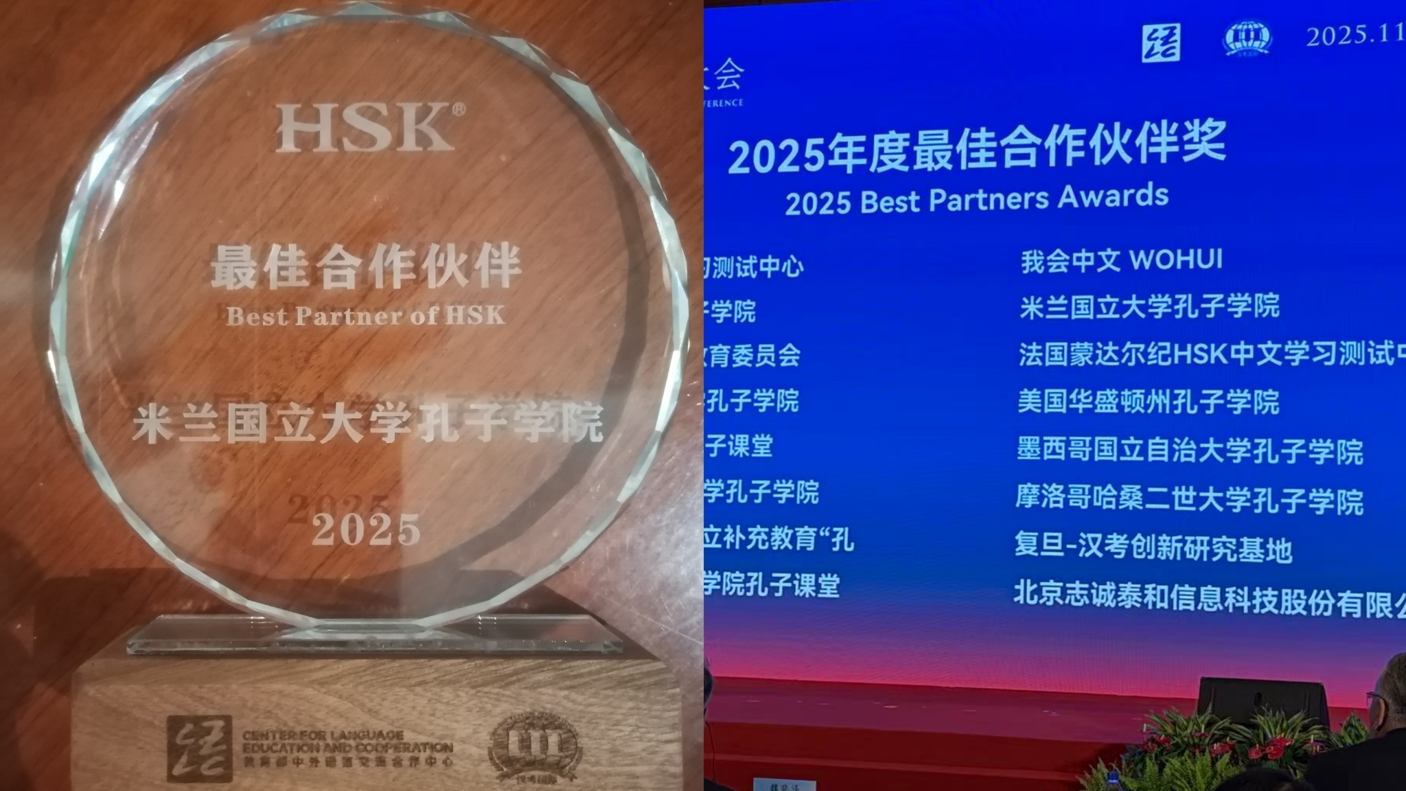 2025年11月15日,在北京举行的世界中文大会平行论坛“2025中文水平考试(HSK)全球合作伙伴大会”上,米兰国立大学孔子学院凭借规范的考务组织、持续提升的服务能力及欧洲地区广泛影响力,荣获“HSK最佳合作伙伴”称号。中方院长傅海峰代表孔院领奖,标志着米兰国立大学孔子学院在国际中文教育与中文考试领域的成就获权威认可。