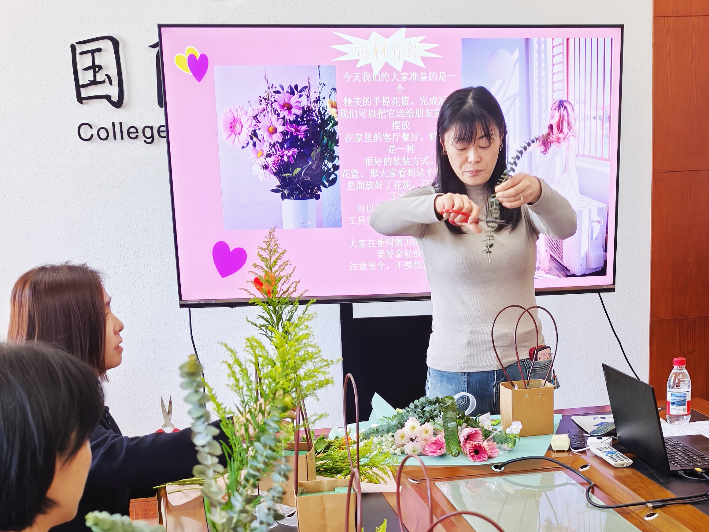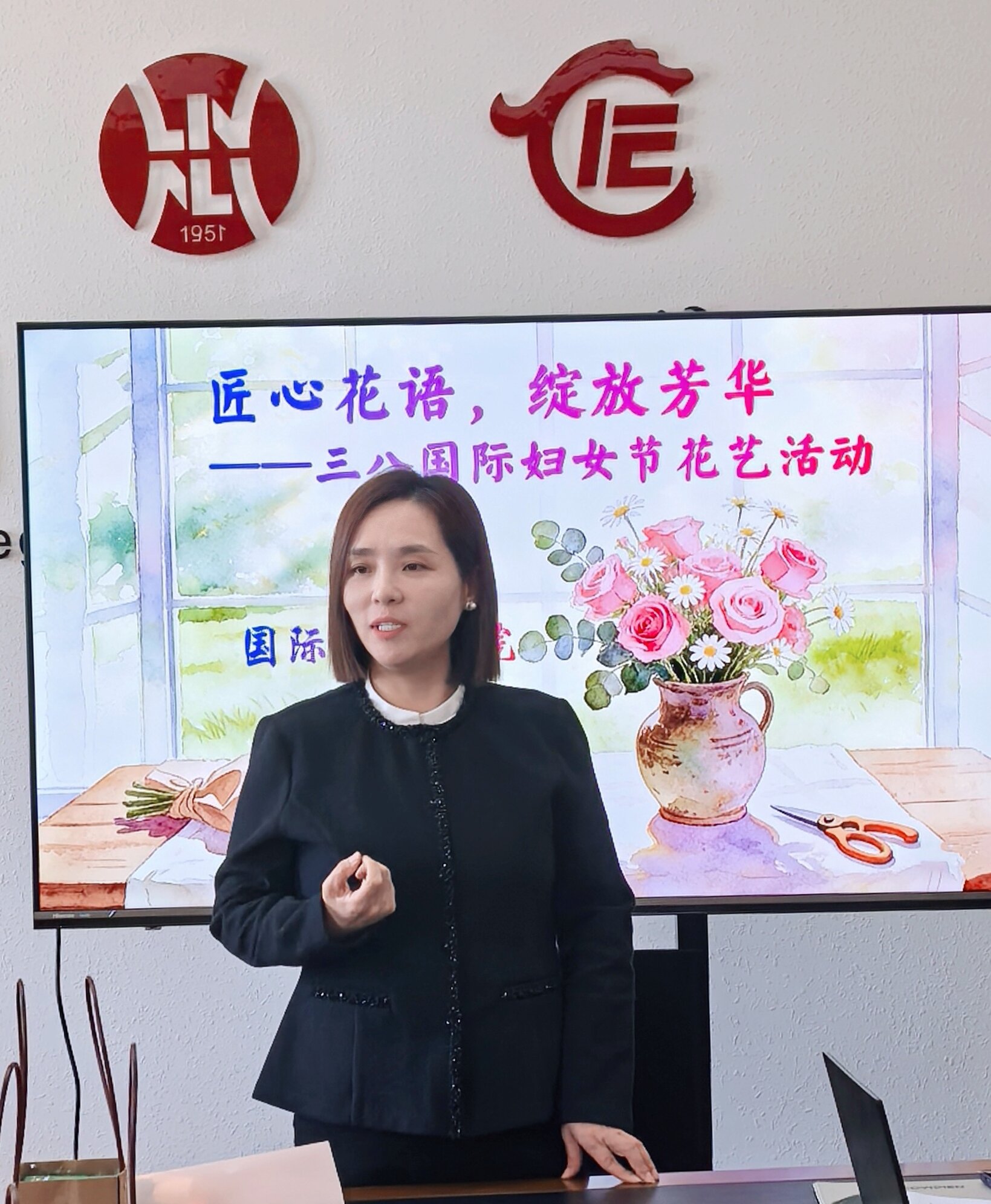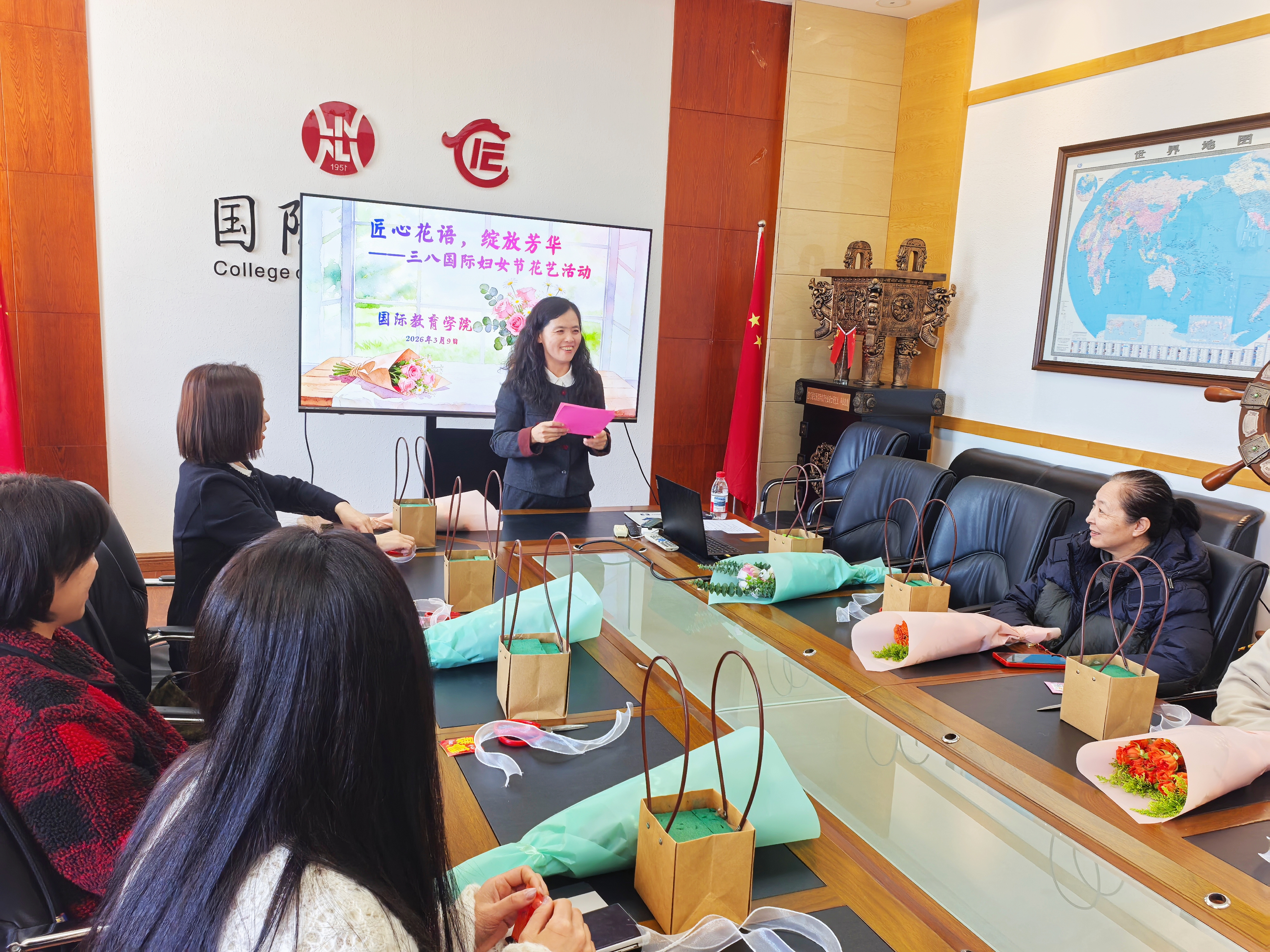 春风送暖,花香盈室。为庆祝三八国际妇女节,丰富女教工精神文化生活,传递学校与学院工会的关怀与祝福,3月9日下午,国际教育学院工会在学院会议室开展“匠心花语,绽放芳华”三八国际妇女节花艺活动。学院全体女教工欢聚一堂,在花艺创作中感受美好,共庆佳节。活动由学院工会主席周正红主持。