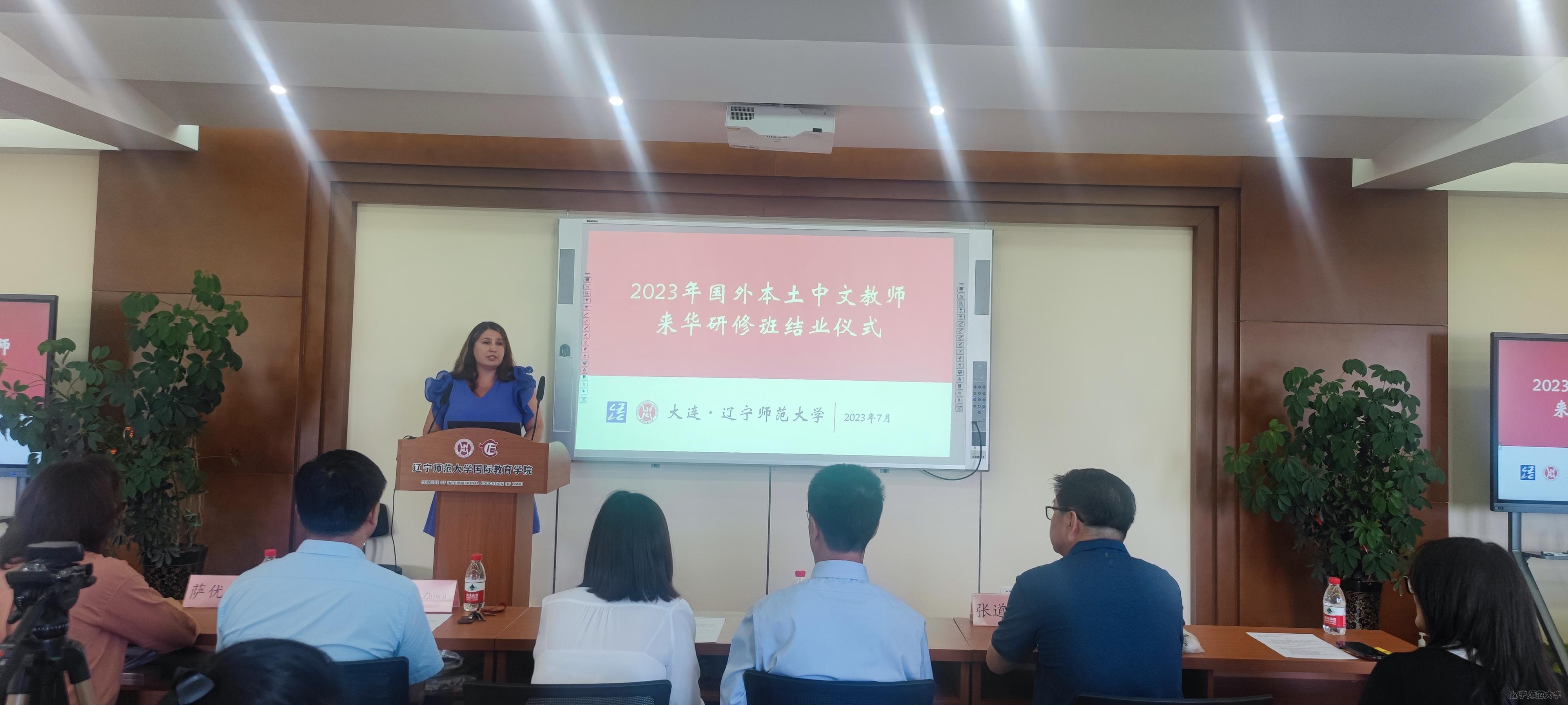 结业仪式上,国外本土中文教师代表发言,表达了他们参加此次研修班的感受。乌兹别克斯坦塔什干国立东方大学萨优拉老师代表国立东方大学对我校成功举办此次活动表达了衷心的感谢,她介绍了我校与东方大学在教育方面的交流合作情况,对两校签订的国际中文教育“2+2”合作项目寄予美好期望。