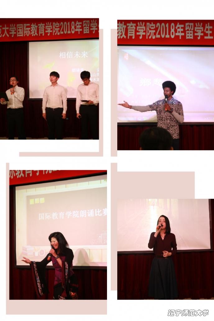 紧张的朗诵过后进入了才艺展示环节。大家欣赏了将于12日代表学校参加大连市演讲比赛的四位选手的精彩演讲。随后两位老师带来精彩表演:徐笑一老师的诗朗诵《春江花月夜》受到了众多同学们的膜拜;朱俊华老师打破传统的朗诵形式,表演了唱诵《将进酒》,把全场的气氛引入最高潮。