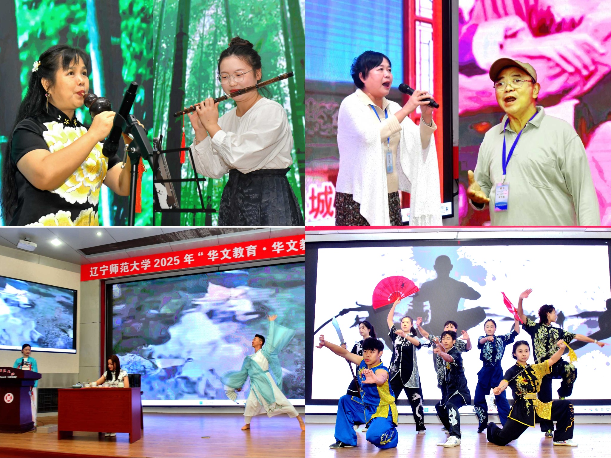 师生代表在仪式上奉献了精彩的文艺演出。泰国华文教师黄智荣与国际教育学院研究生廖宇航表演了葫芦丝与竹笛合奏《月光下的凤尾竹》,西班牙华文教师马志伟、刘学伟带来京剧《遇皇后》《智取威虎山》选段,国际教育学院教师高宁、影视艺术学院教师薛实夫与国际教育学院研究生姜丛珊共同表演了中华茶道,体育学院学生表演了中华传统武术。