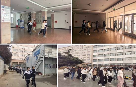 演练开始前,学院已明确演练流程与人员分工,确保各环节有序衔接。随着警报信号响起,演练正式启动。在现场工作人员的引导下,国际教育学院1-4层的师生迅速弯腰低姿、按照预定疏散路线快速有序撤离至安全区域。整个疏散过程紧张高效,全体人员均在3分钟内完成集结,充分展现了师生良好的应急反应能力。