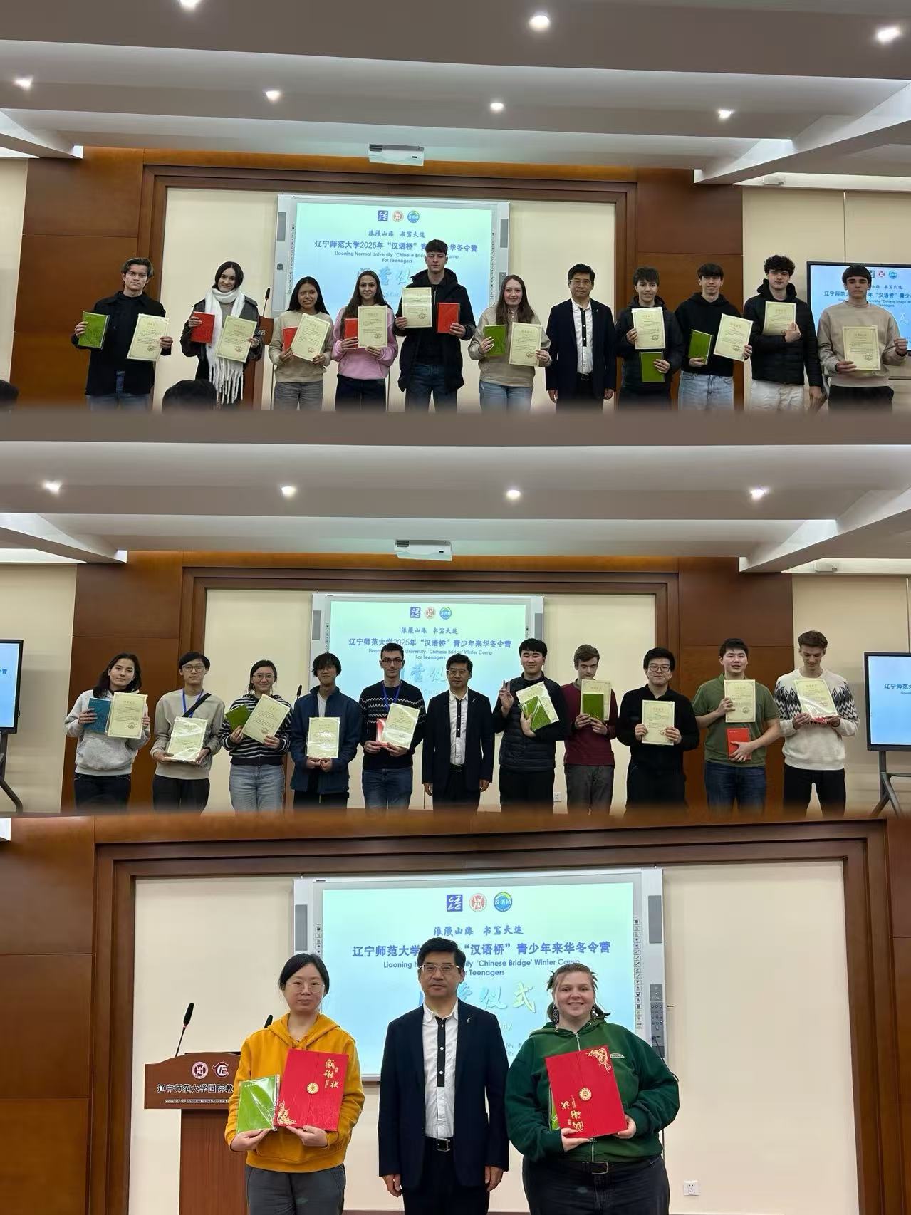 仪式最后,杨文升副院长为营员们颁发结业证书并赠送纪念品。至此,本次“汉语桥”冬令营大连段的活动正式结束。全体营员将启程前往哈尔滨进行为期4天的冰雪文化体验。